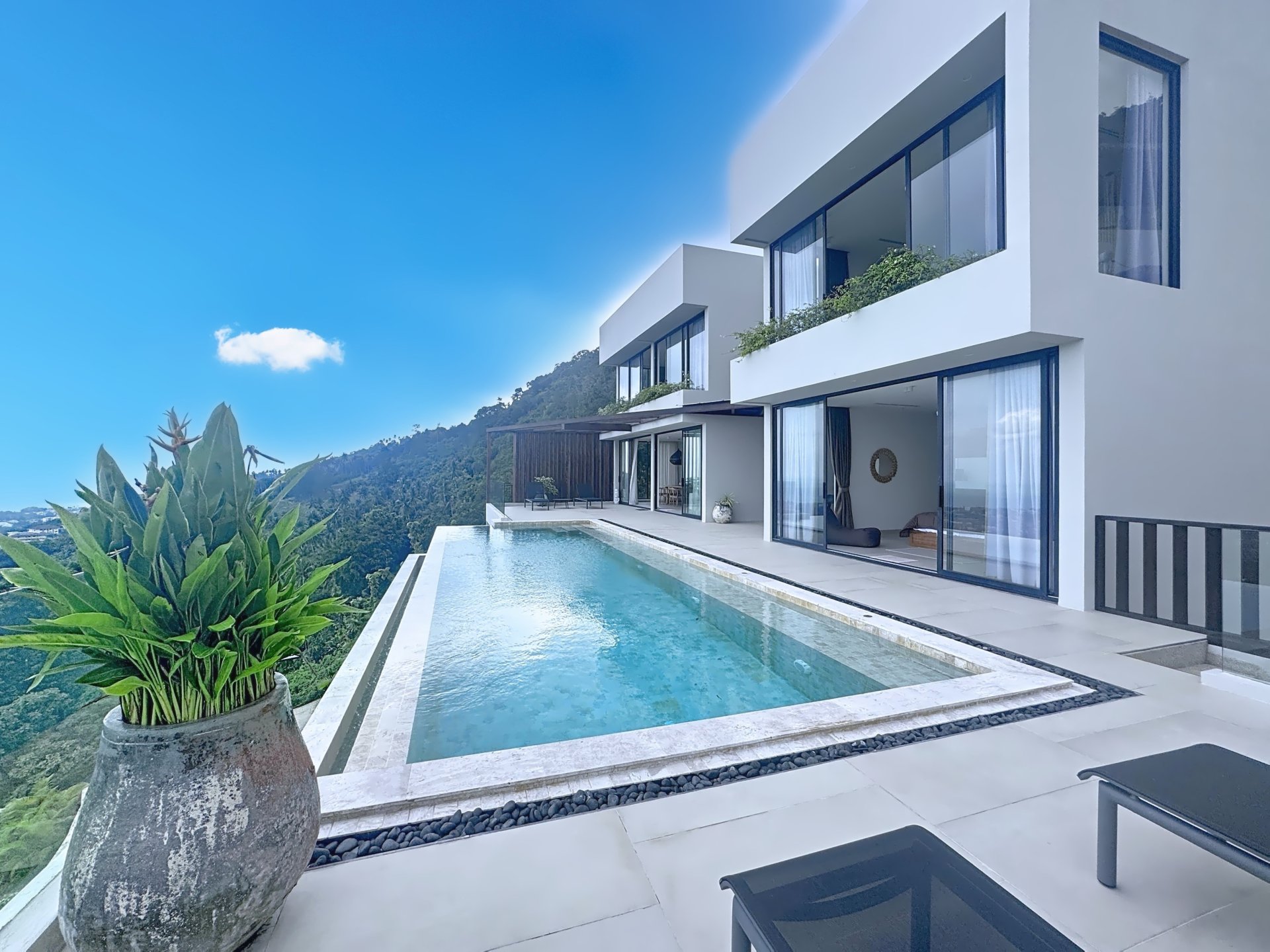 Superbe villa à vendre sur les hauteurs de Chaweng à Koh Samui. D’une surface habitable de 500 m2 habitable sur une parcelle de 898 m2, la villa dispose de 5 chambres et 5 salles de bains ainsi qu’une salle de sport et un bureau.Repartis sur 2 étages avec au premier niveau une grande pièce à vivre de 80 m2 avec une cuisine américaine, salon et salle à manger. Grande baie vitrée donnant sur une terrasse de presque 100m2 avec une piscine à débordement de 12mx4m.