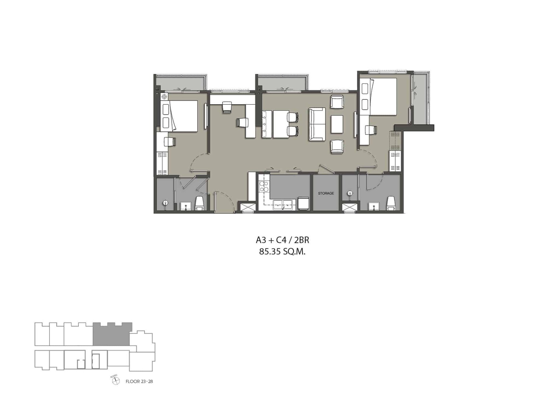 chambre à coucher: 2Bains: 2Espace de vie: 85.35 m²