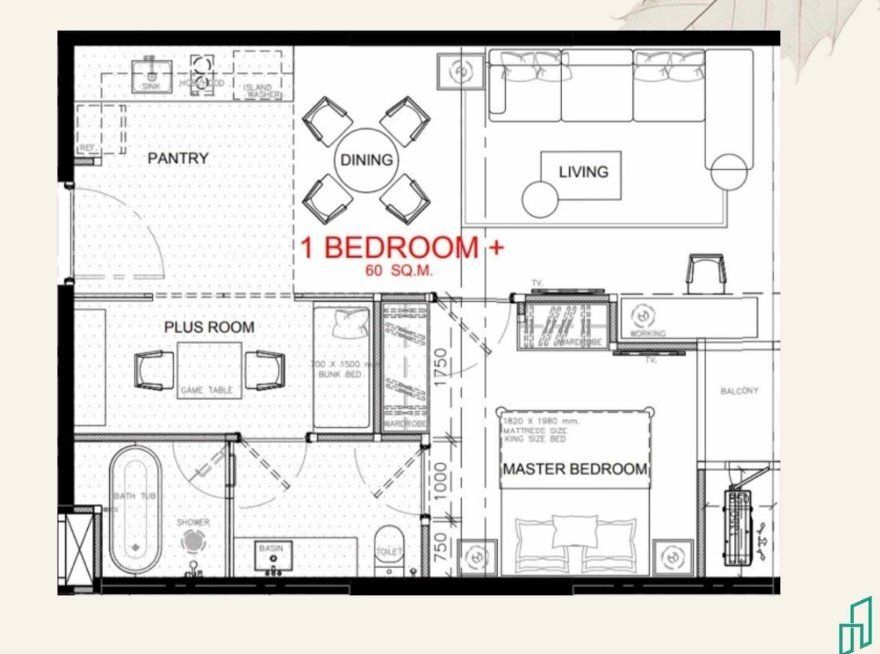 chambre à coucher: 1Bains: 1Espace de vie: 60.2 m²