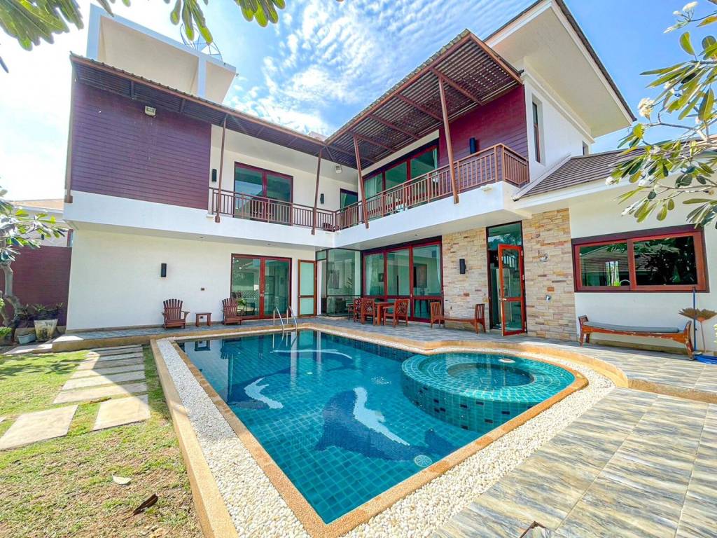This beautiful villa, located just 200 meters from the pristine white sand beach of Dolphin Bay, offers a perfect blend of luxury and convenience. Within a 5 to 10-minute drive, you'll find an array of restaurants, small shops, and resorts. For larger shopping needs, Tesco Lotus and the fresh produce market are only 15 minutes away. The vibrant city of Hua Hin is a mere 30-minute drive, making this property both secluded and accessible.Set in a private villa area, the property boasts breathtaking views of the mountain tops and partial sea views. Spanning three levels on an 800 square meter plot, this villa is designed for those who appreciate space and natural light. The spacious open-plan living room, kitchen, and dining area are adorned with floor-to-ceiling sliding doors, allowing sunlight to flood the interiors and providing direct access to a private swimming pool. The modern kitchen features a large island, ample cabinetry, and extensive counter space, with adjacent storage and laundry rooms for added convenience.