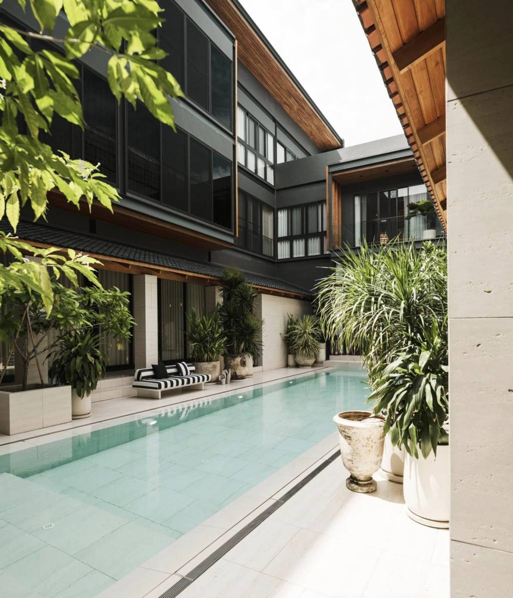 The home is designed with high-end materials including wood and glass elements with open layout spaces. Large windows invite natural light, while the private balconies and expansive patio areas offer tranquil views of the lush greenery and landscaped garden.