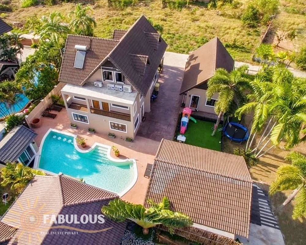 This stunning 3-storey, single detached villa in Rawai, Phuket, now available for 22,750,000 THB, offers an incredible opportunity for a large family or discerning buyer. Originally priced at 28,000,000 THB, this property is a significant investment at its reduced price. Spanning an expansive 1,200 sqm land plot, the villa features five bedrooms, four bathrooms, and two spacious living rooms, providing ample space for both communal activities and personal relaxation. The open-plan kitchen and dining area, along with a separate dining room, add to the villa's charm and functionality. For those considering future expansion, the property includes two separate land title deeds, allowing for the development of an additional house in the vast garden. The villa also boasts a private bar/sala with a built-in BBQ area, perfect for entertaining while overlooking the large garden and children's play area. To enhance your leisure experience, the private steam room is equipped with a Bluetooth sound system and mood lighting, offering direct access to the pool or a refreshing ice bath.