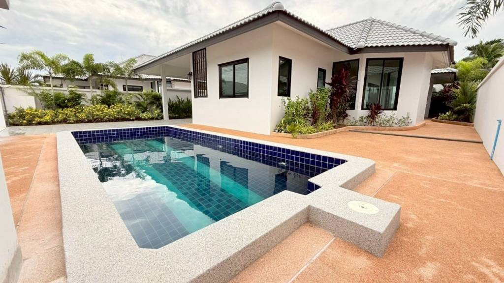 This is Single House 3 Bedrooms, 2 Bathrooms for Sale in East Pattaya. Sitting on 357.2 Sqm of land plot size, 190.73 Sqm of usable area, comes fully furnished and includes a European-style kitchen, a dining area, a spacious living room, and a private garden, including a spacious private swimming pool.Facilities: