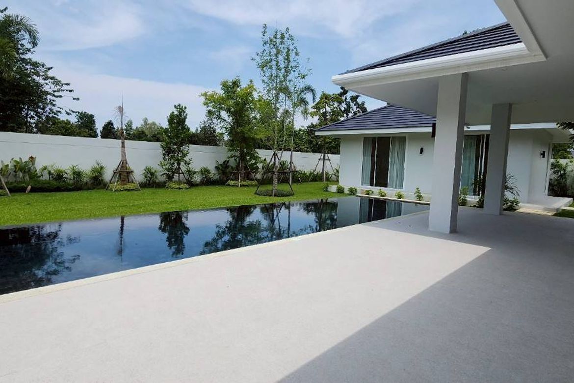 5 Bedroom House for sale in Nam Phrae, Chiang MaiStunning 5-bedroom, 3-bathroom pool villa just entered the market and will not be available for long. The villa is situated in a tranquil and affluent neighbourhood in Namprae, Hang Dong, near some of the best international schools in Chiang Mai. The Residence is situated on almost 1,000 sqm of land, which is secured by a perimeter wall, an electric gate, and a CCTV system. The floor space was deliberately spread across 3 structures, whereas the master bedroom ensuite and 2 kids’ bedrooms with aare located in the main house, where a large living room and high-end kitchen form the centre guest bathroom living piece. The 2nd structure is the pool house which can serve various purposes depending on your needs, it could become the 4th and 5th bedroom, or two home offices or a combination thereof. Could also be used as a guest bedroom with living area, a granny flat, or a gym. The pool house also boasts a small yet fully functional bathroom. The carport forms the 3rd structure on the property and can hold 2 large-sized cars and conveniently has a storagelaundry room included. The entire living space indoors boasts a modern, high quality SPC flooring in fishbone wood design. The kitchen is state of the art with high-end finishes and appliances. Cabinets are in mat black with Italian marble countertop and backsplash. Kitchen appliances include a built-in fridge, freezer, dishwasher, oven, microwave, hood and oversized induction stove. The 13m x 4m swimming pool is fitted with imported tiles and can be accessed directly from the spacious terrace. The terrace is partially covered to cater for both an outdoor dining area and sun decklounge area. Large trees have been planted already and grass has been laid out too, which for convenience is irrigated by an automated sprinkler system. Spotlights illuminate the garden at night creating a wonderful atmosphere all around in what could become our very own sanctuary.