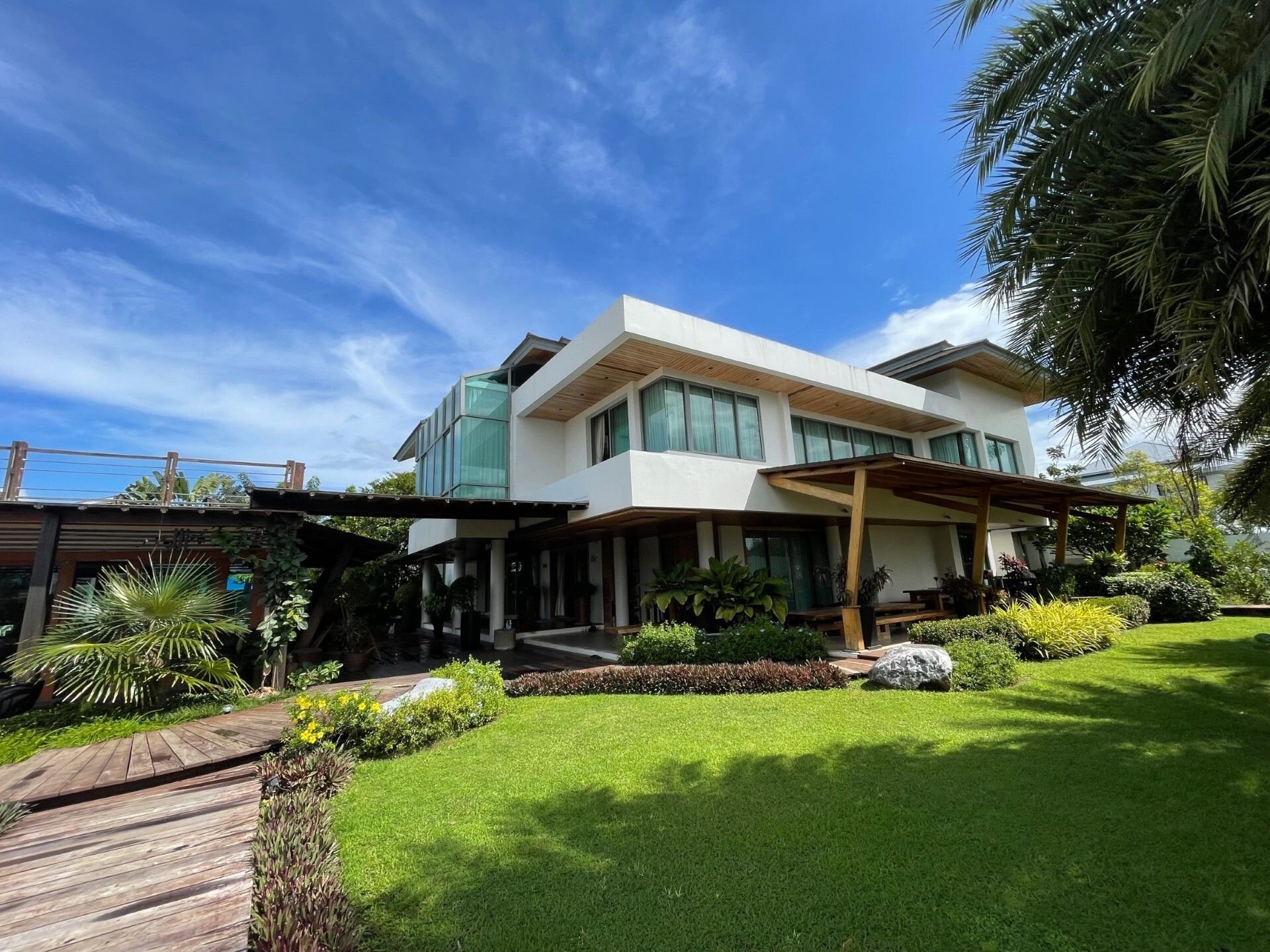 The property is built over 2 floors with 1420 sqm indoors. The Land size is 2 Rai (3200 sqm) Chanote land deed. Thai Freehold. Covered Car park for 6 cars. CCTV. Water from own well.