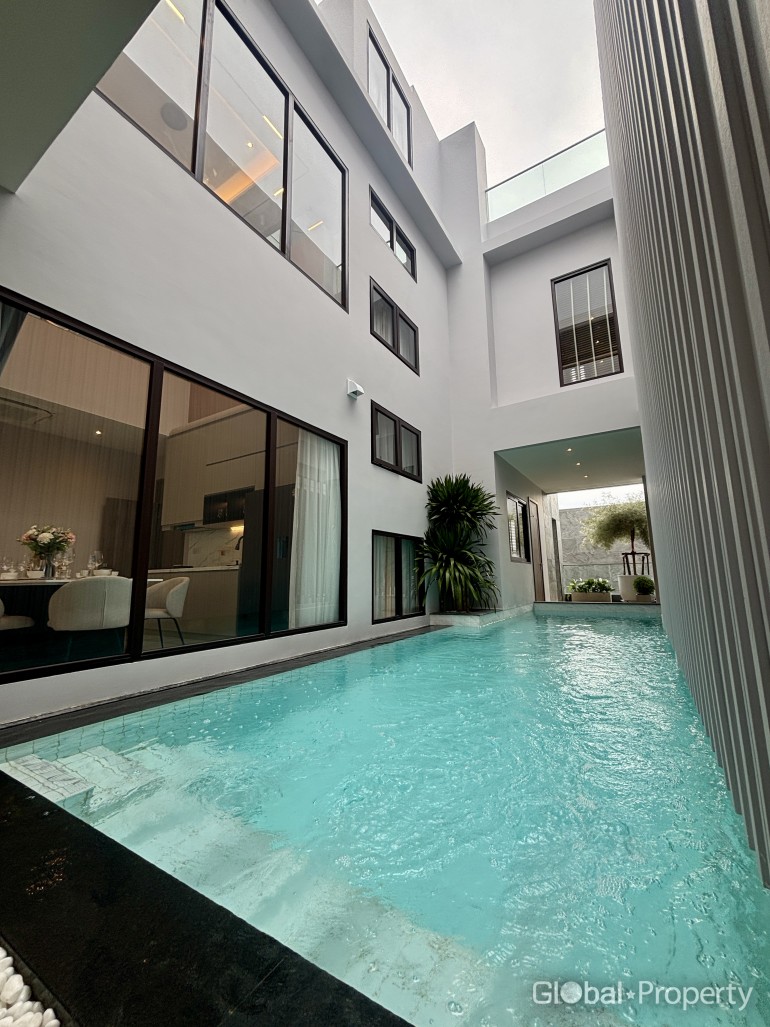 This contemporary, four-story home is located in the exclusive new Tree Villa development in the Na Jomtien area, a project by Siam Inter World Asset, the renowned company behind high-end properties such as Wyndham Jomtien Pattaya and Wyndham Wongamat Pattaya.The property features four spacious bedrooms and five bathrooms, a private balcony, a large living room with high ceilings, a European and Thai kitchen, a dining area, a maid's room, and a private swimming pool with a shady garden - ideal for relaxing or reading by the pool. There is also covered parking for three cars.
