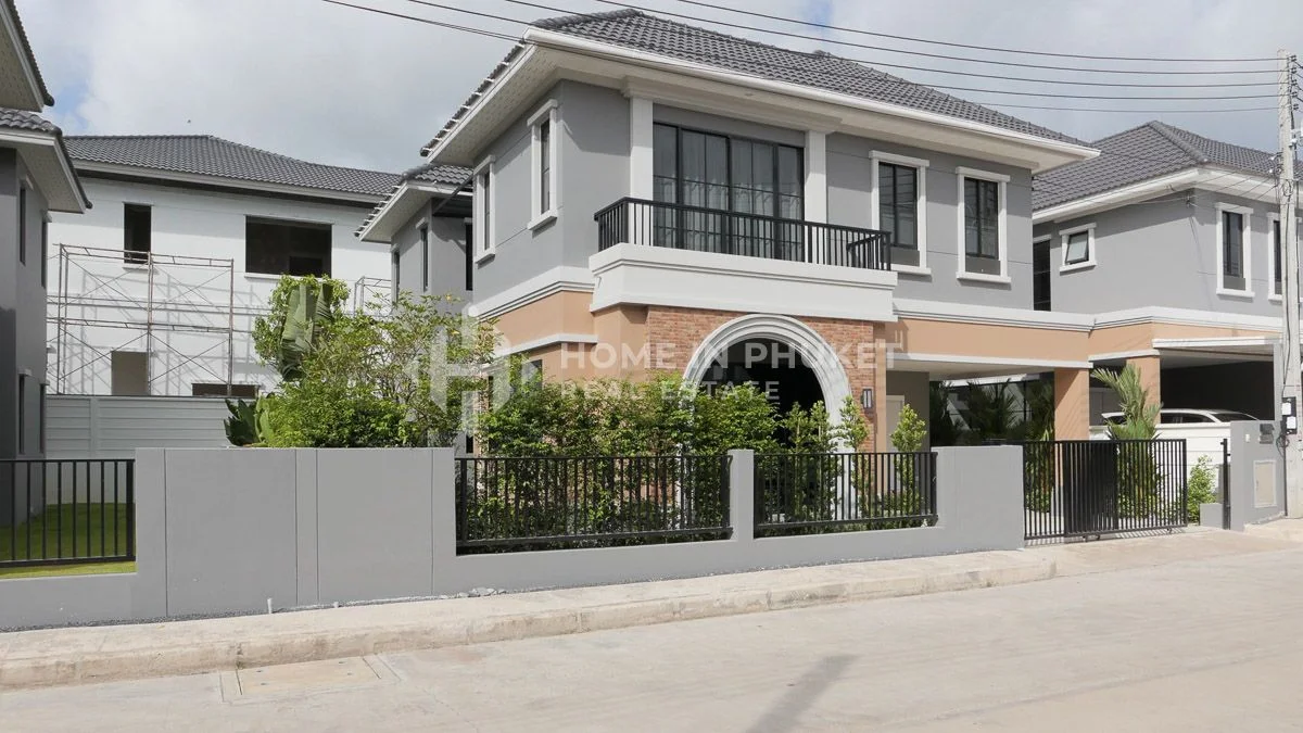 This house with 4 bedroom and 3 bathroom is part of The Crown Estate project in Koh Kaew, Mueang Phuket District, Phuket. The house features a built-up area of 195 sqm across 2 floors on a 248 sqm plot, includes access to a shared pool, 2-car covered parking, and is ready to move in.The villa offers an ideal layout for families, with the ground floor comprising a bright living area, dining space, a well-equipped kitchen, one bedroom, and a private garden. Upstairs, the second floor features three additional bedrooms, including the master suite, connected by a hallway that overlooks the dining area below, enhancing the sense of openness and natural light throughout the home.