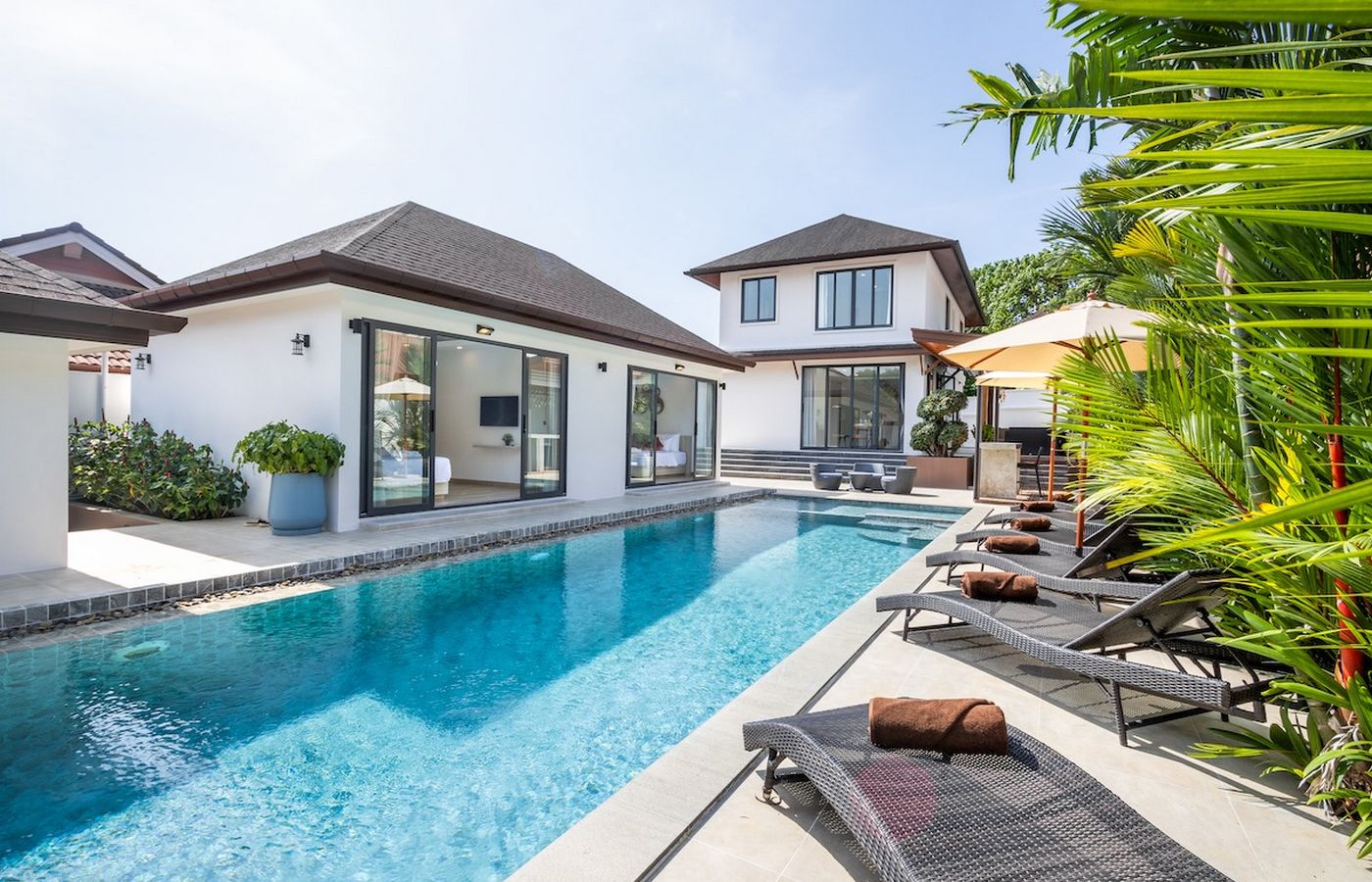 • 5- bedrooms, each with its own ensuite bathroom• Modern tropical architecture across two separate buildings (main villa + poolside pavilion)• Private 12-meter swimming pool with built-in jacuzzi• Outdoor Thai sala for relaxation• Pool bar and BBQ area ideal for entertaining• Spacious open-plan living and dining area• Fully equipped L-shaped western kitchen• Large outdoor terrace with sun loungers and furniture• Landscaped tropical garden• Master suite featuring walk-in closet and bathtub• Laundry room with washing machine• Multiple indoor and outdoor storage rooms• Covered parking for 2 cars• Fully furnished with air-conditioning throughout