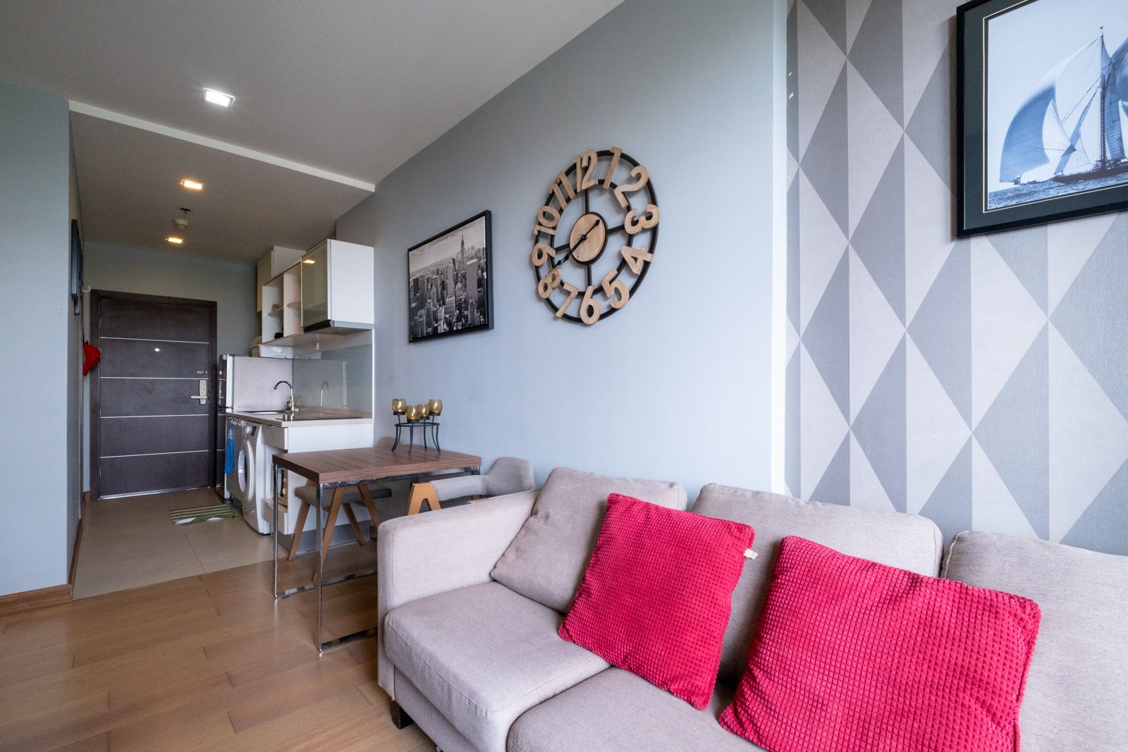 Single bedroom, fully furnished one-bedroom condo in Astra Condominium with a view over the Shangri La Hotel. The entrance comes onto the fully fitted kitchenette, living room with covered balcony. The bedroom is a good size with small sitting area, ensuite bathroom, and separate toilet.