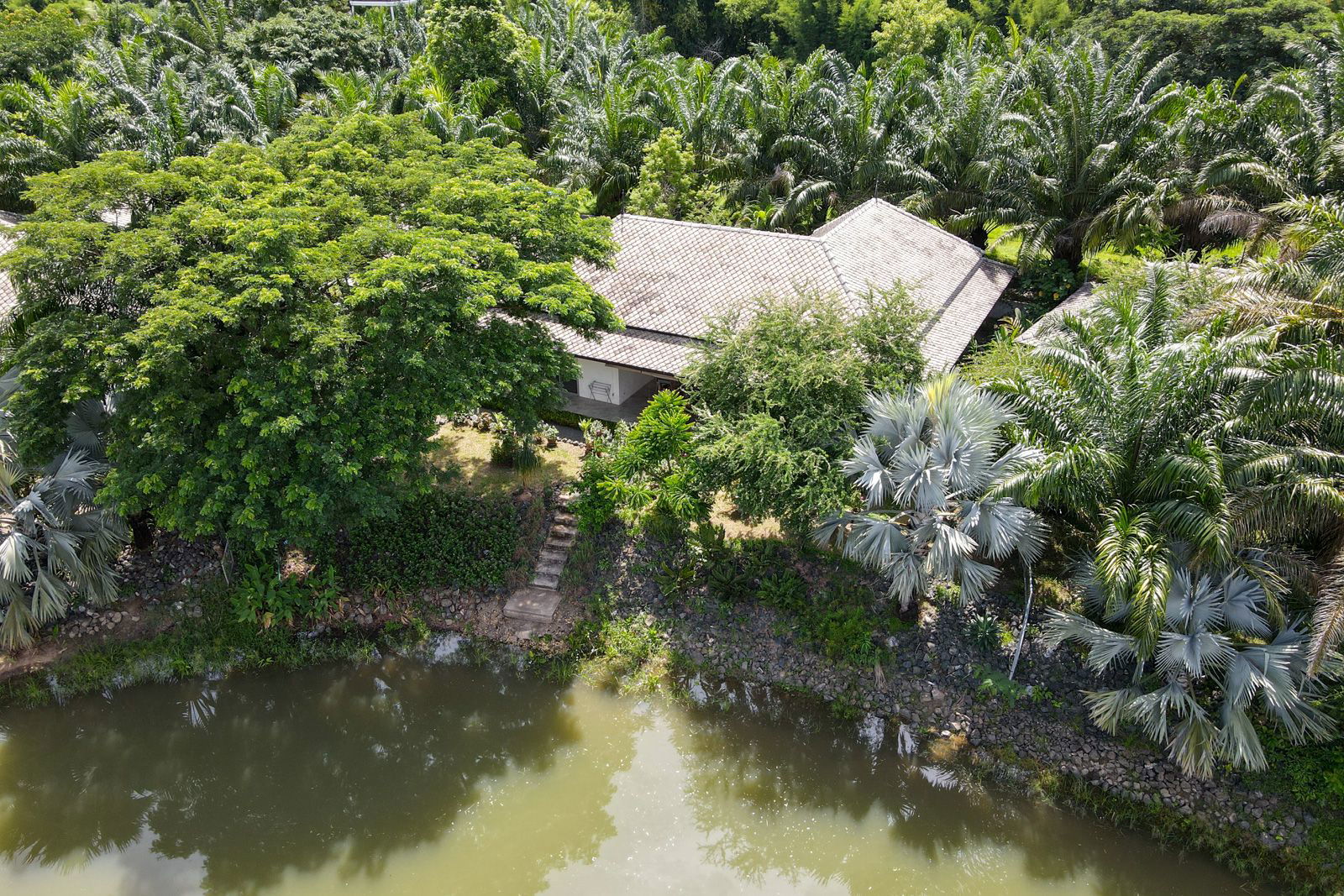 Situated in the picturesque Mae Rim district of Chiang Mai, this accessible home offers a tranquil lakeside retreat. The main house features a large, open-concept living room seamlessly connected to a modern kitchen, providing ample space for comfortable living and entertaining. Two bedrooms offer privacy and comfort, while the expansive patio overlooking the serene lake adds to the serene ambiance.For added convenience, the home is wheelchair-accessible and includes several storage rooms, one of which is equipped with a washing machine. A carport provides covered parking on the premises.Complementing the main house is a free-standing guesthouse, featuring its own living room, small kitchen, bathroom with WC and shower, and a walk-in closet. This self-contained unit opens to a private balcony, affording guests stunning views of the lake.Features