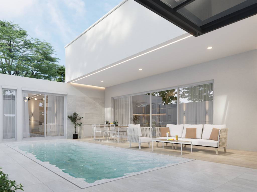 The main benefits include a new development villa with modern architecture, a private pool, and efficient single-level design. The indoor-outdoor flow enhances daily living and entertaining. The open-plan kitchen and living room support family time and social gatherings. Three bedrooms and three bathrooms add comfort for residents and guests.