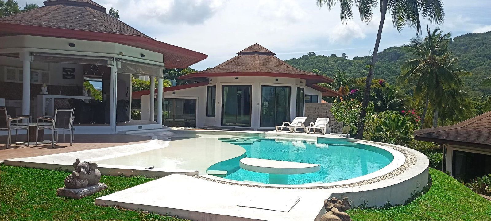 Unique villa in a private gated community with stunning views and spacious outdoor area. Features cascading pavilions, open entrance, garden, Bali-style kitchen, dining area, entertainment pavilion, master bedroom with ensuite and sea views, office, private pool. Additional 3 bedrooms with ensuites and private pool. Conveniently located in sought-after Bangrak area.Beach: 4 minsFishermans Village: 7 mins Supermarket: 8 minsCentral Festival: 10 minsAirport: 13 mins