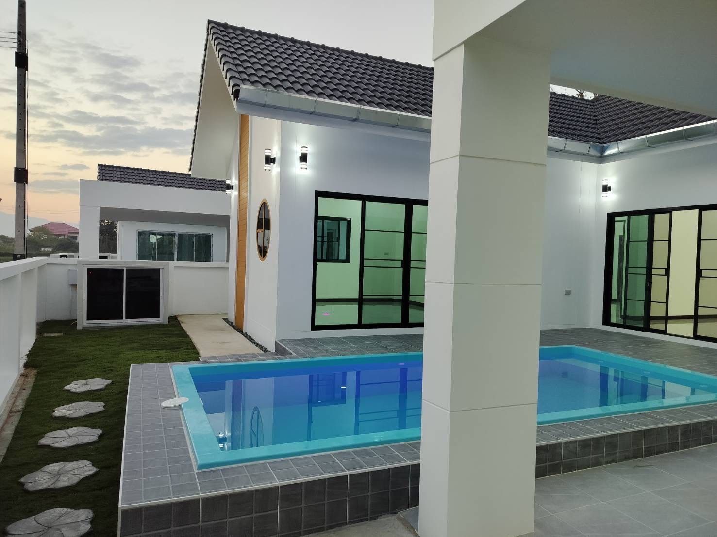 3 bedrooms, 4 bathrooms, saltwater swimming pool, living room and kitchen, 2 parking spaces. Corner plot with road frontage on 2 sides. 86.5 sq.wa. land area. Beautiful backyard view, lawn, private pool villa resort-style living.