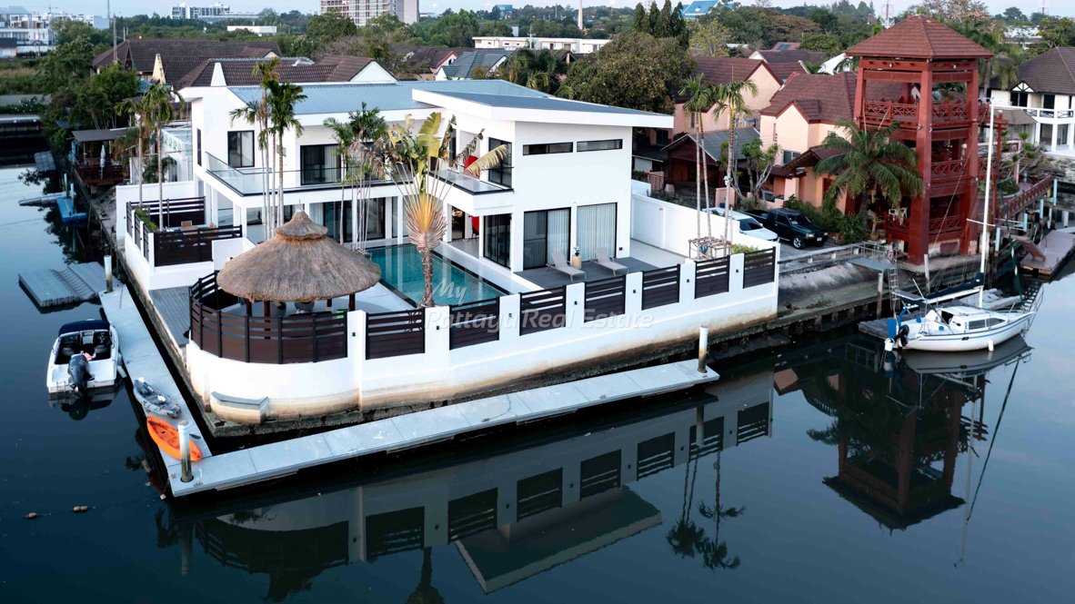 175 Sq.Wah 8 Bedroom Luxury Villa in Jomtien Yacht Club 1 For Sale - Modern double story home with a private pool, garden and boat mooring in Na-Jomtien.Land Size: 175 Sq.Wah / 700 Sq.M
