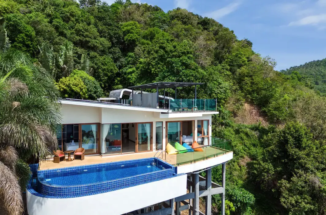 Experience breathtaking panoramic views and the pinnacle of luxury living in our hillside villa. This spacious retreat is designed for relaxation and rejuvenation, offering modern amenities and a private gym to keep you in top form during your stay. With its serene location in Leam Yai, you'll enjoy tranquility and easy access to the best of the island.Overlooking Koh Samui's northwest coast, this 3-bedroom villa boasts a private pool, spacious living areas, and stunning sea views. and a little private gym. Each bedroom, designed for ultimate comfort, features an ensuite bathroom and direct access to outdoor spaces. The open-plan living area, with its fully equipped kitchen, flows seamlessly into the outdoor terrace, perfect for dining under the stars.