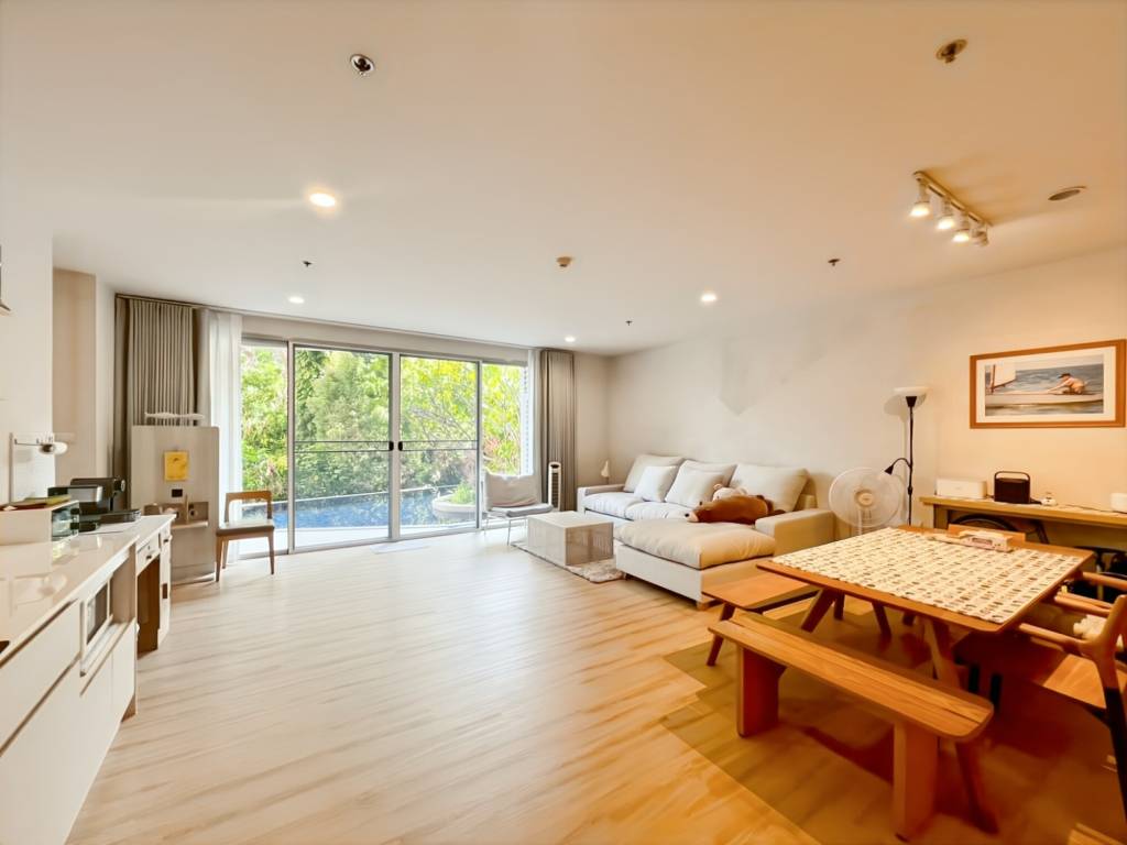 The condo features an open-plan living and dining area with light wood flooring and a neutral color palette. Large floor-to-ceiling sliding glass doors connect the living space to a balcony or terrace and to the poolside garden, creating a strong indoor-outdoor living concept. A spacious L-shaped sofa, coffee table, area rug and built-in low storage cabinets complete the main lounge area.