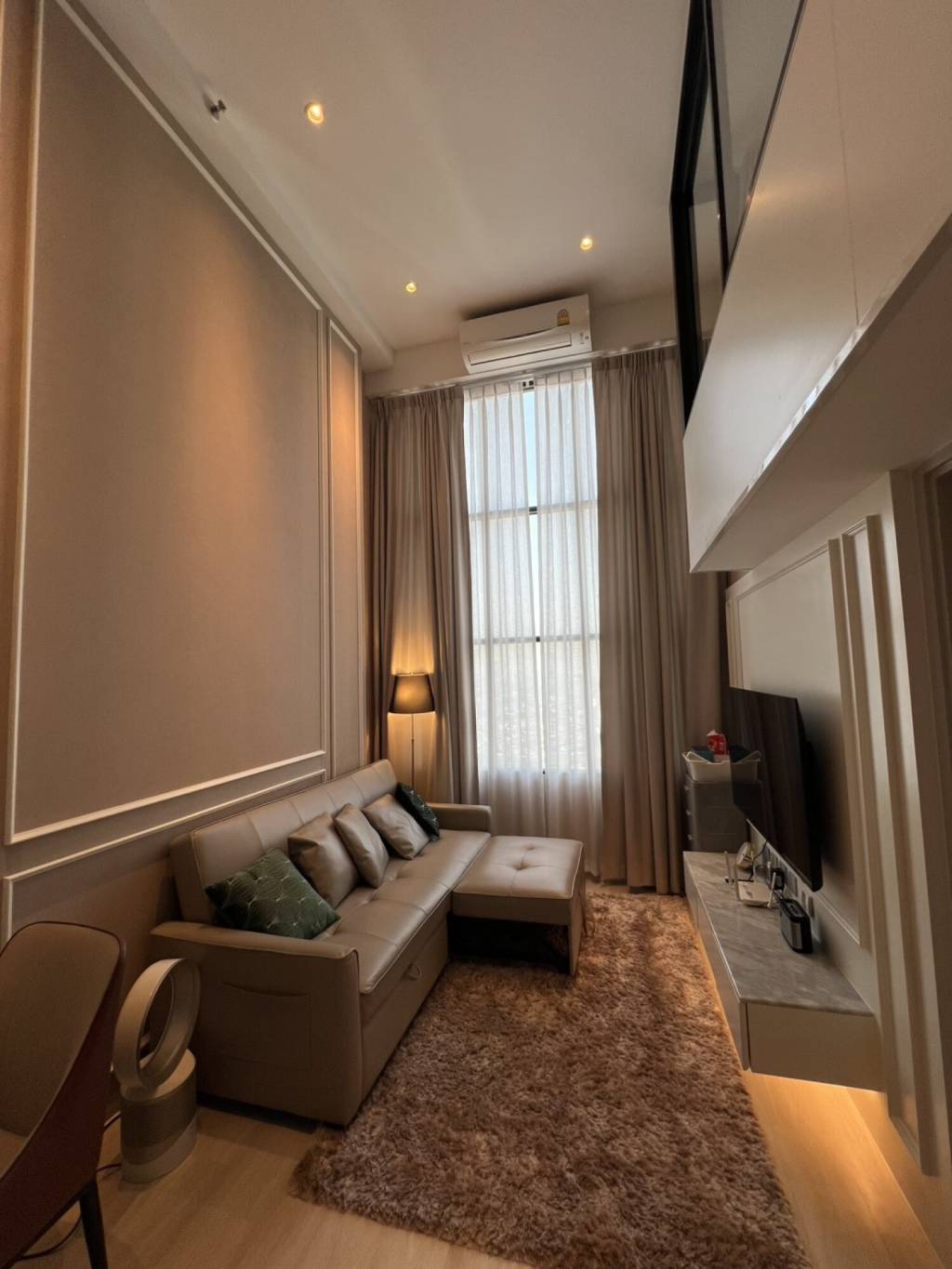 The lower level provides an open-plan living and dining area with a modern feel. A tall window and floor-to-ceiling curtains create an impressive high ceiling effect. The living zone includes a sectional sofa with chaise, accent cushions, and an upholstered ottoman. A soft area rug adds comfort underfoot. A wall-mounted TV and TV console with storage offer practical entertainment space. An air conditioning unit serves the living area for everyday comfort.