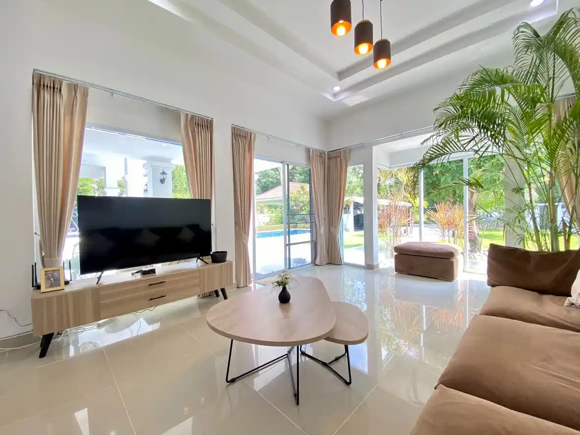 Imagine a home where life flows effortlessly from one moment to the next. This isn�t just a house; it�s a thoughtfully designed sanctuary within the prestigious Baan Wang Tan community, created for those who value comfort, privacy, and time spent with loved ones. The single-story design eliminates stairs, making it a perfect forever home for families or retirees. From the moment you step inside, the open-plan layout draws you towards the heart of the home: a seamless connection between the elegant interior and your private garden oasis, where the swimming pool glistens under the tropical sun. This is a home designed not just for living, but for living well.A Seamless Flow of Light, Space, and SerenityThe villa�s European-inspired architecture is built around the experience of daily life. Every space is crafted to feel both connected and distinct, providing a perfect balance of family togetherness and personal retreat. The Main Living Space: Expansive glass doors and an open-concept design flood the living and dining areas with natural light.