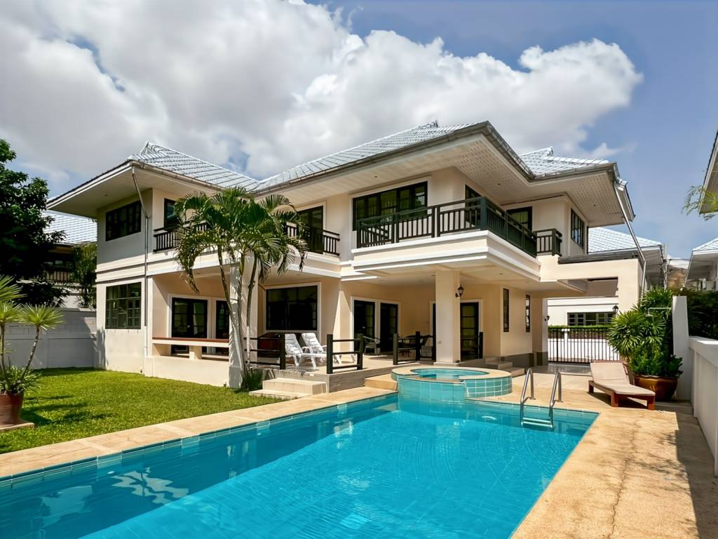 The villa sits in Hua Hin Grand Hills, a modern residential project of 89 units in Hin Lek Fai, Hua Hin. The setting features detached two-story homes, paved internal roads, and organized streets. Lush greenery, mature trees, and a hillside or mountain backdrop provide a scenic and tranquil environment.