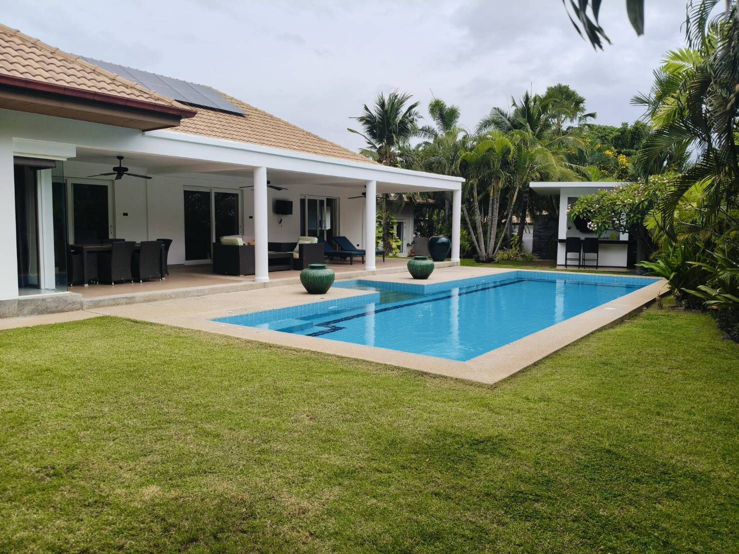 This beautiful pool villa is set on a spacious 832 sqm corner plot which makes it really quiet and private. The property is designed for both indoor and outdoor living, with a bright open-plan living and dining area and a large covered terrace. The 12 x 4 m saltwater pool is ideal for cooling off or entertaining, surrounded by a well maintained garden and a outside covered kitchen A fully detached guesthouse with en-suite bathroom provides added privacy for visiting friends or relatives. This property is sold fully furnished and includes a 15 kW solar power system with batteries