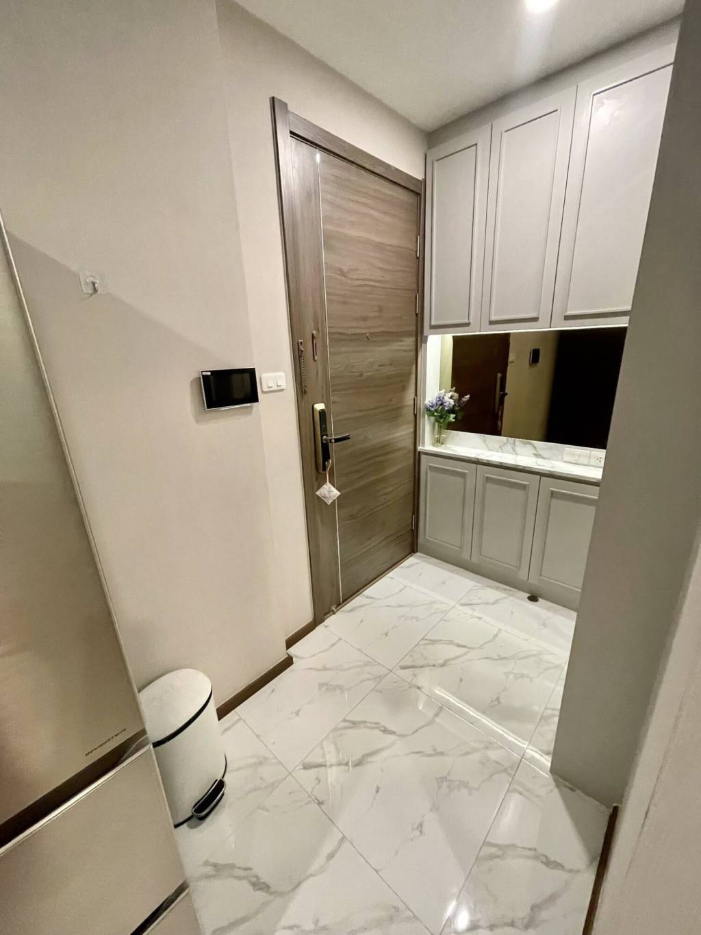 The entryway delivers a modern first impression with marble-look tiled flooring and built-in cabinetry. Upper and lower storage cabinets and mirrored closet doors provide generous organization. A large wall mirror and recessed countertop enhance the sense of space and function.