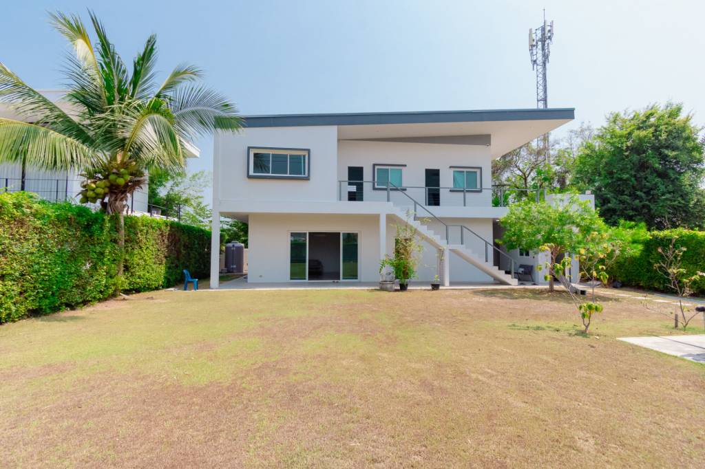 Modern 3-Bedrooms Villa OverviewThis contemporary freehold villa in Sam Phraya, Cha Am offers a modern two-story design with clean lines, flat roof architecture, and generous interior space of 250 square meters on a 496 square meter land plot. The property provides an inviting first impression with a white facade, large windows, and a broad front lawn that enhances the overall introduction to this home.