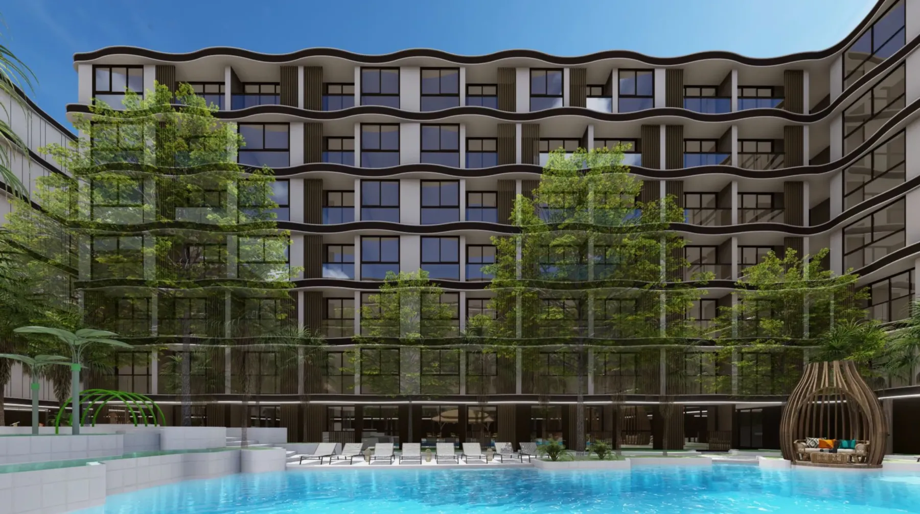 The interior space of VIP Tropika is thought out to the smallest detail. Two large swimming pools with cozy relaxation areas, water bars, a modern fitness center, coworking for remote work and a children's club for young residents. The underground parking allows you to preserve the aesthetics of the territory, and the landscape design creates the atmosphere of a secluded resort corner.Tropika offers studios from 30 m², apartments with 1-3 bedrooms (45-130 m²) and townhouses of 112 m². Each living space is designed with functionality and aesthetics in mind.