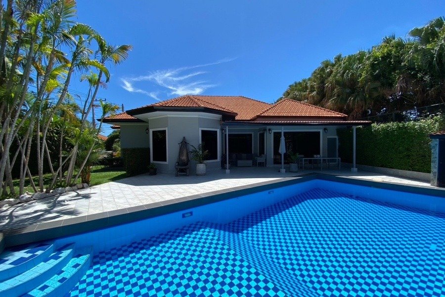 THIS PROPERTY IS RENTED UNTIL SEPTEMBER 2025 AND WILL BECOME AVAILABLE FOR SALE THEN.Explore this exquisite 3-bedroom, 2-bathroom villa located in the serene area of Hua Hin 114. With a spacious living area of 220 sqm on a 600 sqm plot, this fully furnished property features a stunning 6m x 12m swimming pool, modern kitchen, and a beautifully landscaped garden. Ideal for families or investors, this freehold villa offers a perfect blend of luxury and comfort. Additional amenities include a car park and a low annual common fee of just 24,000 THB.