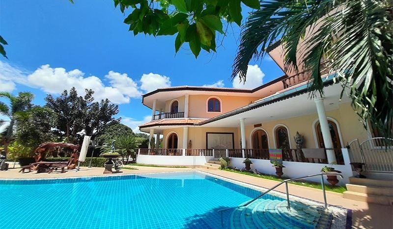 Built-in 2009, this mountain-view property located in the West of Hua Hin. This luxury and elegant mansion perfectly exhibits the style of design in its spacious, rustic simplicity. Though 11 years old, the house is in perfect condition, a testament to the enduring quality of the build and appliances in the home.The property benefits from a beautifully flat terrain of picturesque green lush landscaping, with the all-day sun for enjoying the spectacular long big swimming pool. The floor plan makes the home ideal for hosting guests with a total of 11 bedrooms as well as a small apartment for an in-house nurse. (The main house has 3 big bedrooms/3 bathrooms, guesthouse 6 bedrooms/3 bathrooms and maid house 1 bedroom /1 bathroom) There is also a big elevator to the second floor providing for the elderly. The well-equipped home also boasts a working, a piano room, a garage, and an automated irrigation system, as well as a security system that includes a double electric gate.
