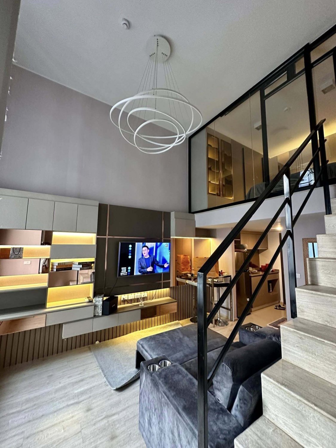 Who is looking for a good location near Lang Ekmai Thong Lo, convenient to travel to the motorway, fully furnished, ready to stay, built-in furniture, beautifully decorated. Duplex 26+ 11 = 37sqm, high ceiling, 1 bedroom, 1 bathroom.