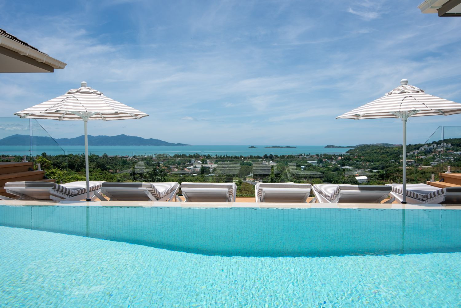 Luxury Pool Villa in Bophut is a stunning 5-bedroom hillside retreat in Koh Samui, set on 1,486 sqm of landscaped land with 547 sqm of refined living space. Designed in an elegant contemporary tropical style, it offers privacy and breathtaking panoramic sea views over Bophut Bay towards Koh Phangan.The villa features five en-suite bedrooms, including a standout master suite with a bespoke seashell walk-in shower, plus spacious open-plan living and dining areas that flow seamlessly to a white-tiled infinity saltwater pool and expansive sun deck. A dining sala for ten and a peaceful garden terrace complete the resort-style living experience.