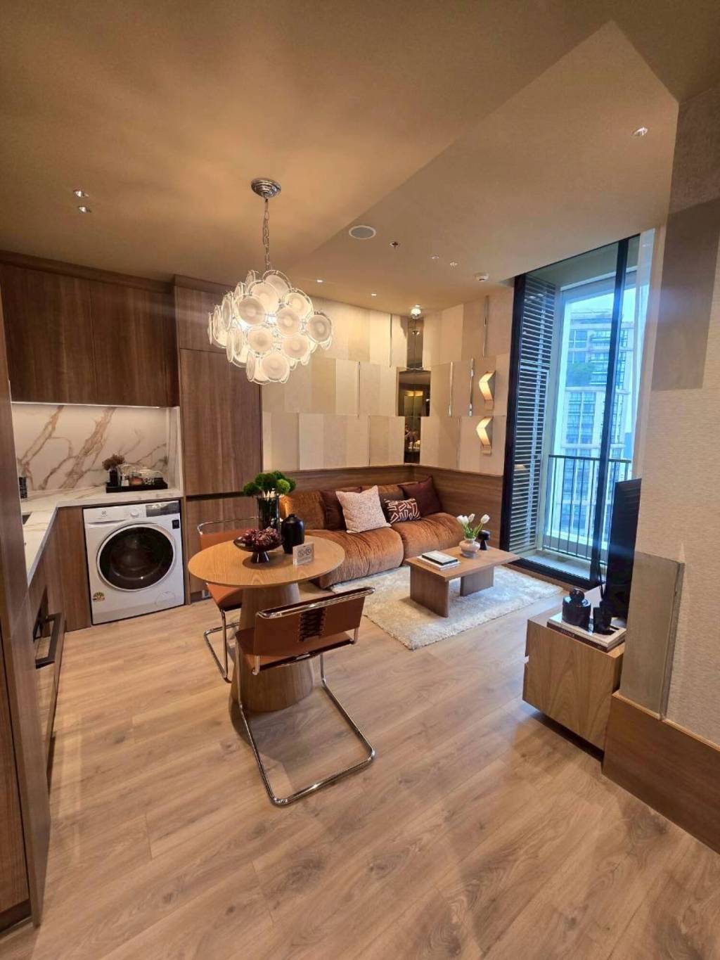The modern kitchen features built-in cabinetry with a wood finish and a marble-effect backsplash. An integrated cooktop is installed for compact meal preparation. The washing machine is neatly integrated into the kitchen for everyday convenience. A round dining table with four contemporary chairs sits under a feature pendant light or chandelier.