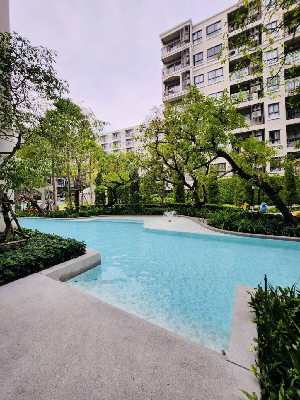 The surroundings feature multiple residential buildings arranged around the main pool and garden zone. Daily living is supported by on-site common areas and walkways. The pool and landscaped gardens provide relaxing outdoor space within easy reach of the unit.