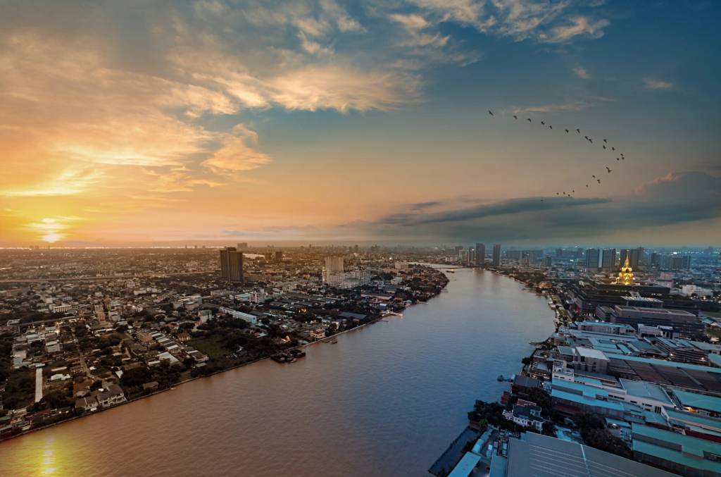 The condo is located on Thanon Nakhon Chaisi in the Dusit district of Bangkok. The setting offers a blend of urban skyline, river frontage, and a wide open horizon. From the project, you can see the broader city landscape with high-rise buildings and mixed-use developments along the riverbanks.