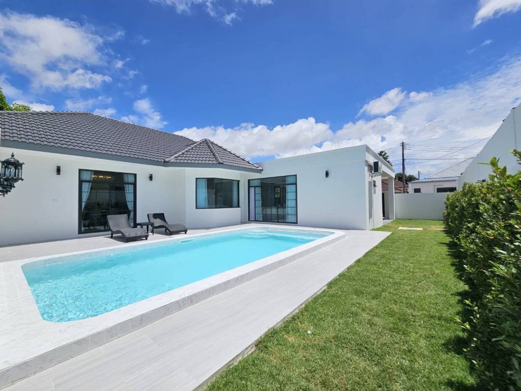 This is New Renovated 4 Bedrooms, 5 Bathrooms House for Sale in East Pattaya. Is Available in Thai Name Ownership, sitting on 440 Sqm of lans plot size, 250 Sqm of usable area, comes full furnished, European kitchen, spacious design and high quality built-in furniture. Enjoy the large shaded garden and the amazing saltwater pool that is perfect for relaxing. All rooms are air-conditioned for comfort, making this a peaceful place to stay.