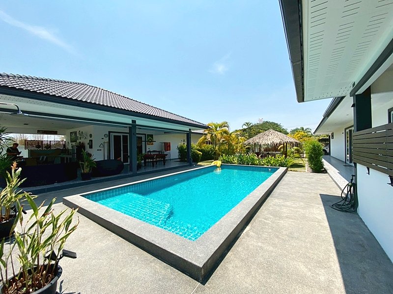 Property OverviewThis spacious dual-villa property in Cha-Am offers a practical and versatile layout, featuring two fully furnished houses facing each other across a private 10 x 4 meter swimming pool and landscaped garden. The design provides flexibility for multi-family living, retirement, or rental income potential in a peaceful residential setting surrounded by greenery.Each villa includes 2 bedrooms, 2 bathrooms, and an open-plan living, dining, and kitchen area. One villa includes a large storage room currently used for fishing equipment, while the equivalent room in the second villa has been configured as an outdoor toilet. Both homes also feature generous covered outdoor living areas, with the main house offering a fully equipped outdoor Thai and Western kitchen, lounge seating area, and pool table.