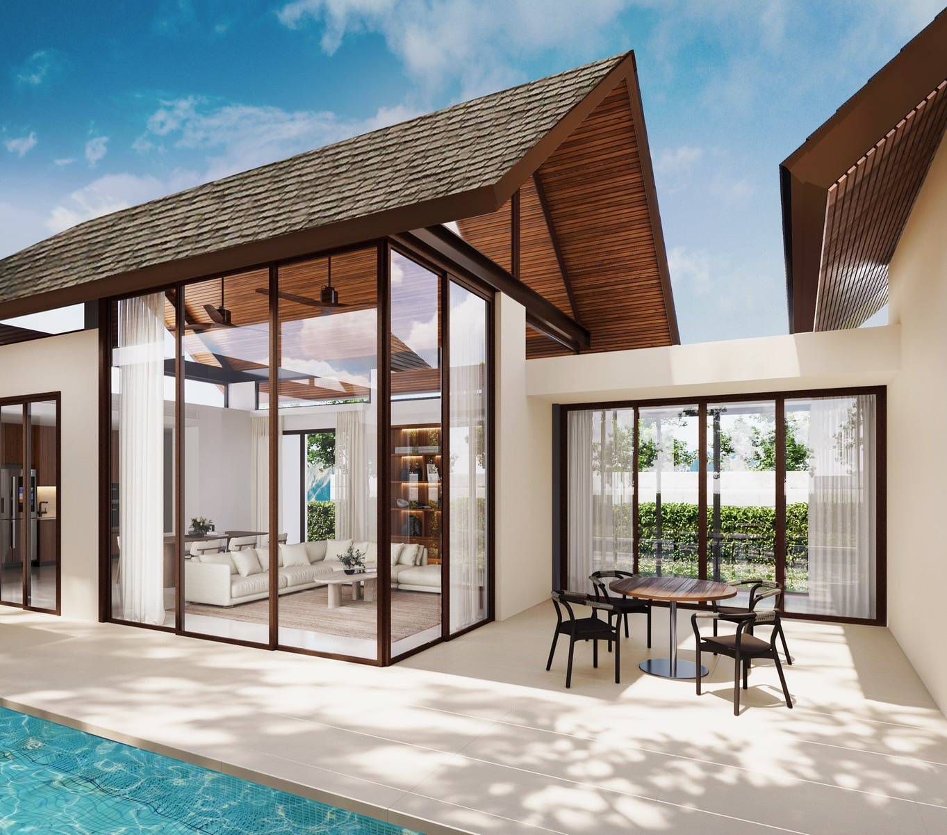 Two bedroom and three bedroom villas are available, featuring spacious living areas that open directly to a private swimming pool. Each villa includes a fully equipped kitchen, a master bedroom with an en suite bathroom, a landscaped private garden, and on site parking.